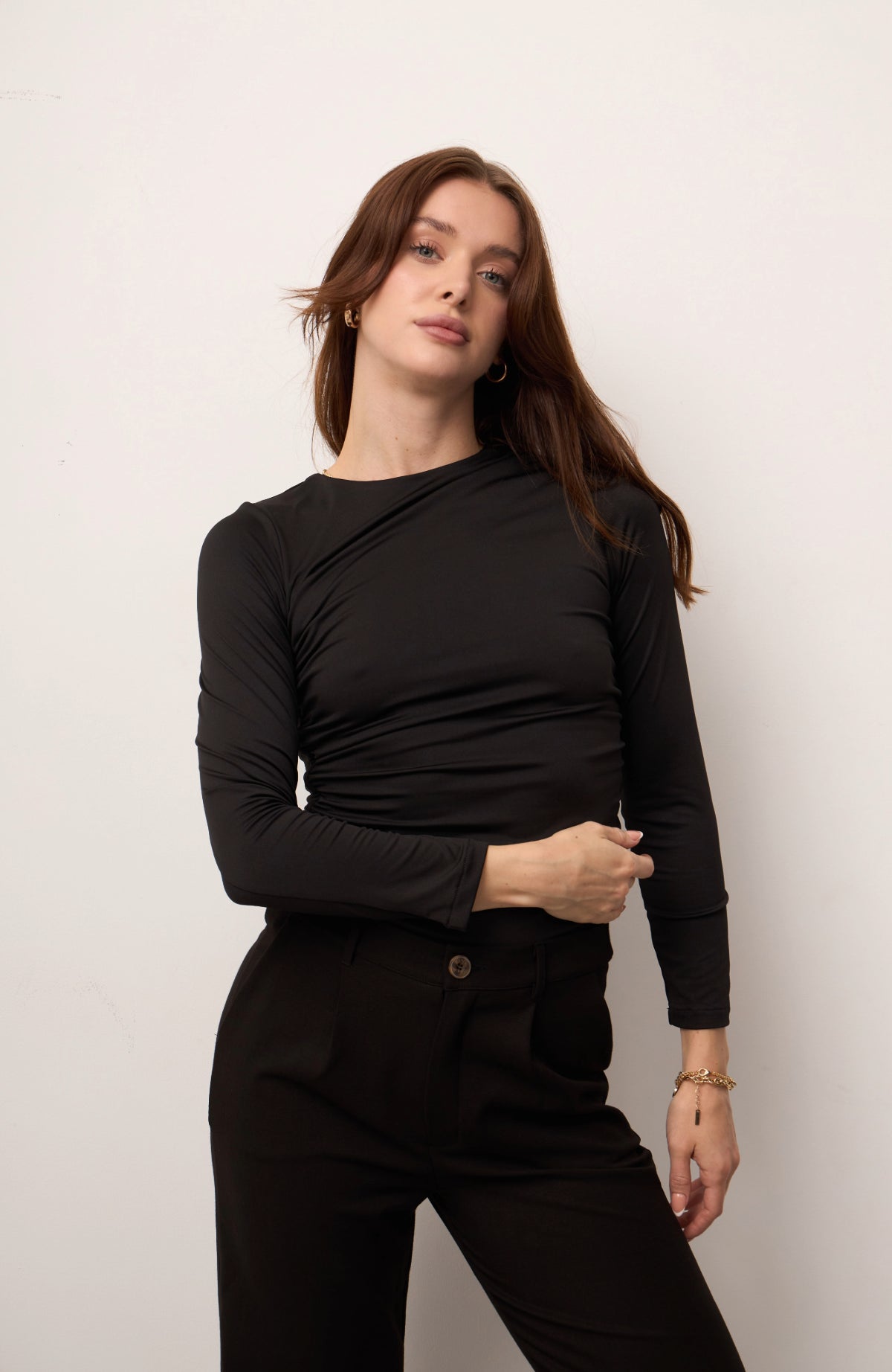 Minimalismo con acento femenino. Este polo de lycra se ajusta con suavidad al cuerpo, mientras el drapeado en la cintura estiliza con delicadeza. De cuello redondo y manga larga, es una prenda ideal para destacar en la sencillez.